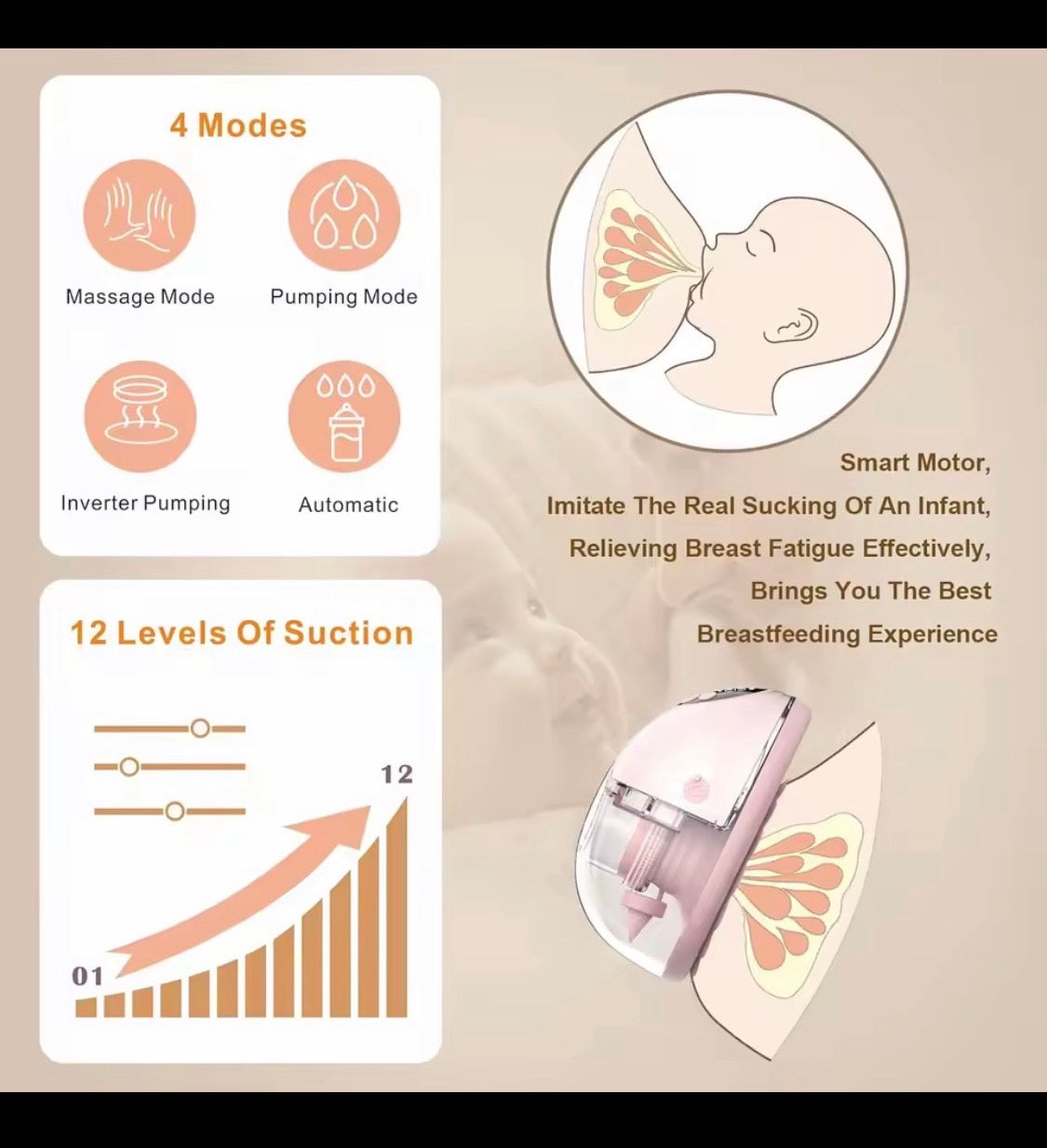 Tire-lait portable ultra silencieux avec 3 modes et 12 niveaux d'aspiration réglables.